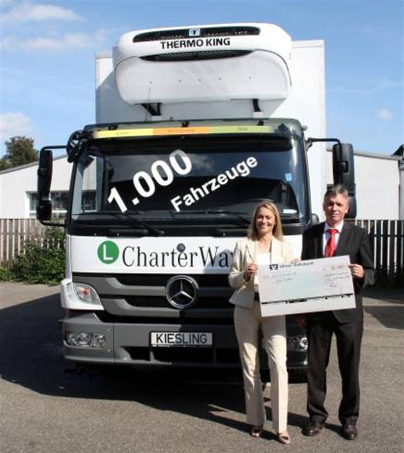 Anlässlich der Übergabe des 1000. Kühlfahrzeuges an die Mietflotte von Mercedes-Benz CharterWay stellt die Kiesling Fahrzeugbau GmbH, Dornstadt-Tomerdingen, einen Spendentopf in Höhe von 10.000 Euro für die gemeinnützige Hilfsorganisation „Die Tafeln“ zur Verfügung. Zehn Tafeln sollen bei der Anschaffung von Kühlfahrzeugen unterstützt werden.