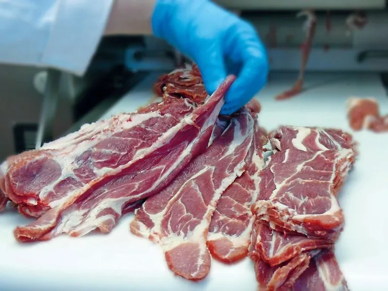 The ESB-SH circular blade cutting machine rapidly and easily cuts uniform meat slices and strips. Maja - © Maja