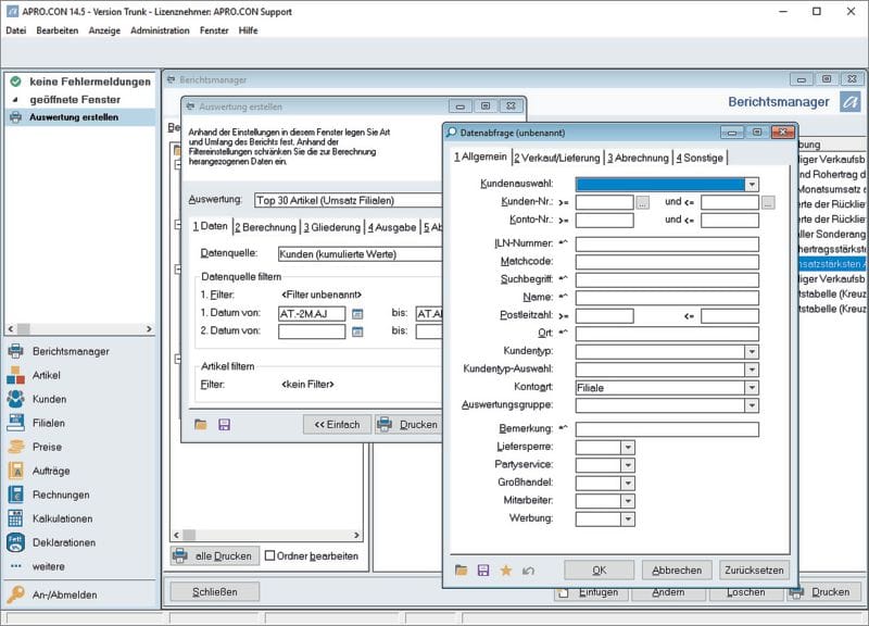 Das Management-Modul Apro.con bietet über 100 Vorlagen für Berichte und Auswertungen. Fleischer erstellen damit ohne großen Aufwand Auswertungen wie Quartalszahlen, Abverkaufsstatistiken oder Durchschnittsverkaufswerte. Wer kunden- oder lieferantenspezifische Daten benötigt, erstellt mit dem Berichtsmanager individuelle Berichte. Diese lassen sich in Darstellungsart und Layout je nach Bedarf anpassen und für die jederzeitige Verwendung abspeichern.