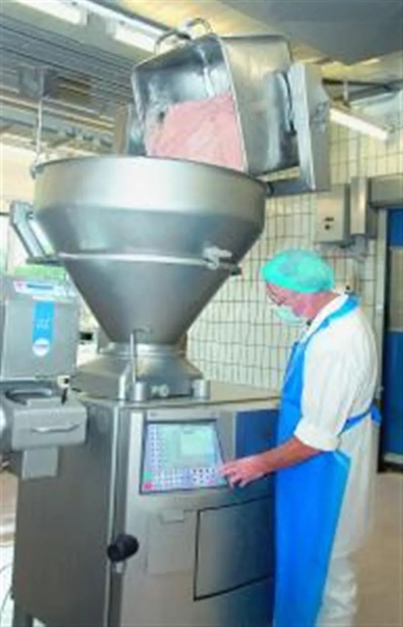 In der Produktion werden ganz bewusst unterschiedliche Vakuumfüller für die verschiedenen Aufgaben eingesetzt. „Während im Handwerk eher Allrounder gefragt sind – da hat man ja oft nur einen Füller –, sind in der Industrie Spezialisten von Vorteil. Es ist einfach nicht wirtschaftlich, mehrmals am Tag die Sorte zu wechseln“, weiß Jägle, räumt aber ein: „Der VF 628 istim Prinzip ein Allrounder, wird bei uns aber ebenfalls als Spezialist eingesetzt.“ Bis zu 7.200 kg/h soll der VF628 leisten und baut dabei einen Fülldruck von 72bar auf, mit dessen Hilfe auch kalte, feste Massen zuverlässig verarbeitet werden können. Mit nur halb so viel Druck kommt der VF 634 aus, fördert, als reiner Brühwurstspezialist, aber die doppelte Menge an Brät. „Die theoretisch mögliche Geschwindigkeit beim Füllen schöpfen wir nie ganz aus“, erklärt Jägle. Auch qualitative Aspekte spielen beim Arbeitstempo eine wichtige Rolle. „Würden wir zum Beispiel Stangenware auf Anschlag füllen, gäbe das imFertigprodukt ein nicht ganz so schönes Schnittbild.“