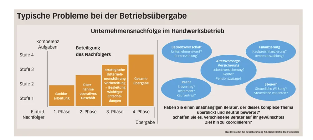 Die Betriebsübergabe in einem Handwerksbetrieb ist ein komplexes Thema. Experten empfehlen für einen reibungslosen Generationswechsel eine frühe Planung, eine für beide Seiten vertretbare Preisfindung sowie einen Notfallplan.