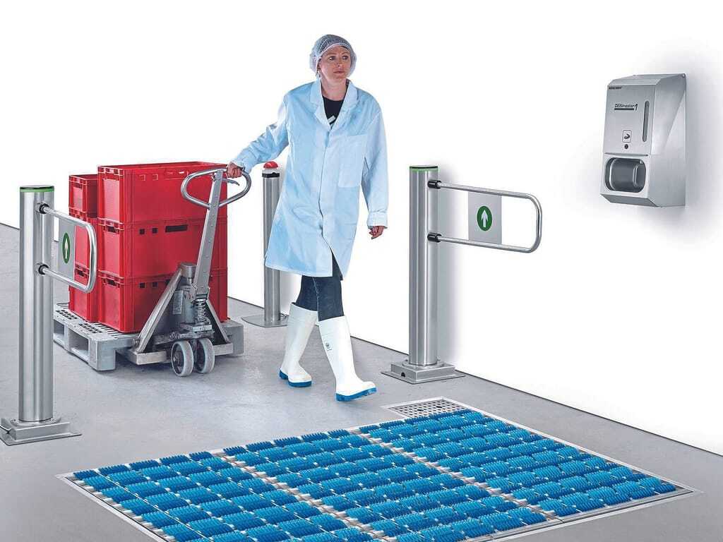 Alle Clean Field Reinigungsfelder lassen sich an individuelle Hygieneanforderungen anpassen. Für eine Zugangskontrolle kann das Reinigungsfeld mit einem Automatik-Schwenktor ausgestattet werden. Außerdem stehen weitere Komponenten zur Verfügung – angefangen von Handdesinfektions- oder Eingangskontrollgeräten mit Drehsperre bis hin zu einer kompletten Kompakt-Hygieneschleuse.