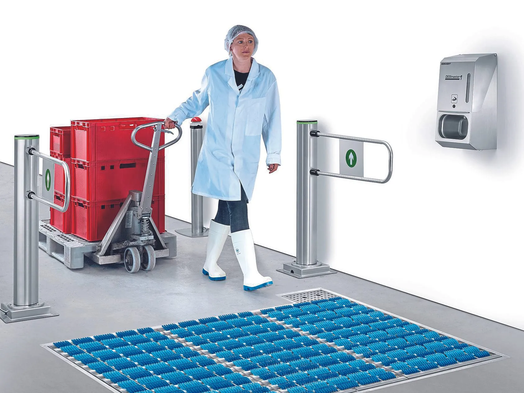 Kohlhoff Hygienetechnik, Unna, zeigt die neue Modellreihe Clean Field HD-Line. Dieses Reinigungsfeld kann auch von schweren Flurförderfahrzeugen (Gesamtbelastung bis 5.000 kg) befahren werden. Das hilft, Verunreinigungen oder eine Schmutzverschleppung beim Warentransport zu vermeiden. Denn allein durch das Befahren oder Begehen der Reinigungsfelder werden die in Kassetten integrierten selbst schwingenden Bürstenelemente unmittelbar in Bewegung versetzt und reinigen semiaktiv (mechanisch) sowohl Räder und Rollen als auch Schuhsohlen — wahlweise nass oder trocken. Bei der Nassreinigung sorgt eine Dosierautomatik dafür, dass immer ausreichend Reinigungs- und Desinfektionsflüssigkeit zur Verfügung steht.