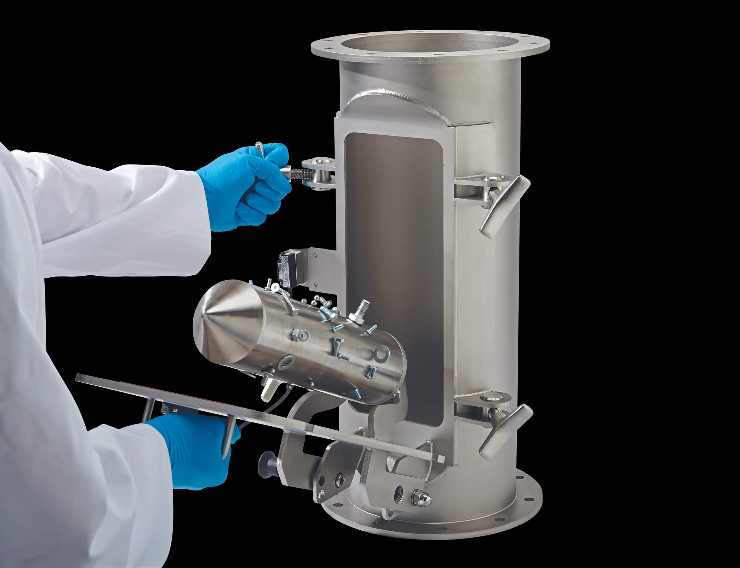 Durch die Tür mit vertikaler Aufhängung ist die Überprüfung auf Verunreinigungen ein Kinderspiel. Der Magnet lässt sich von Hand oder mit einem Schaber öffnen und reinigen. Kleinere Metallteile, wie Kugeln oder abgebrochene Gewinde, lassen sich über die konische Oberseite des Magnetkerns schieben und entfernen. Um zu verhindern, dass der Magnet während des Produktionsprozesses geöffnet wird, kann der Abscheider mit einem Sicherheitsschalter ausgestattet werden.