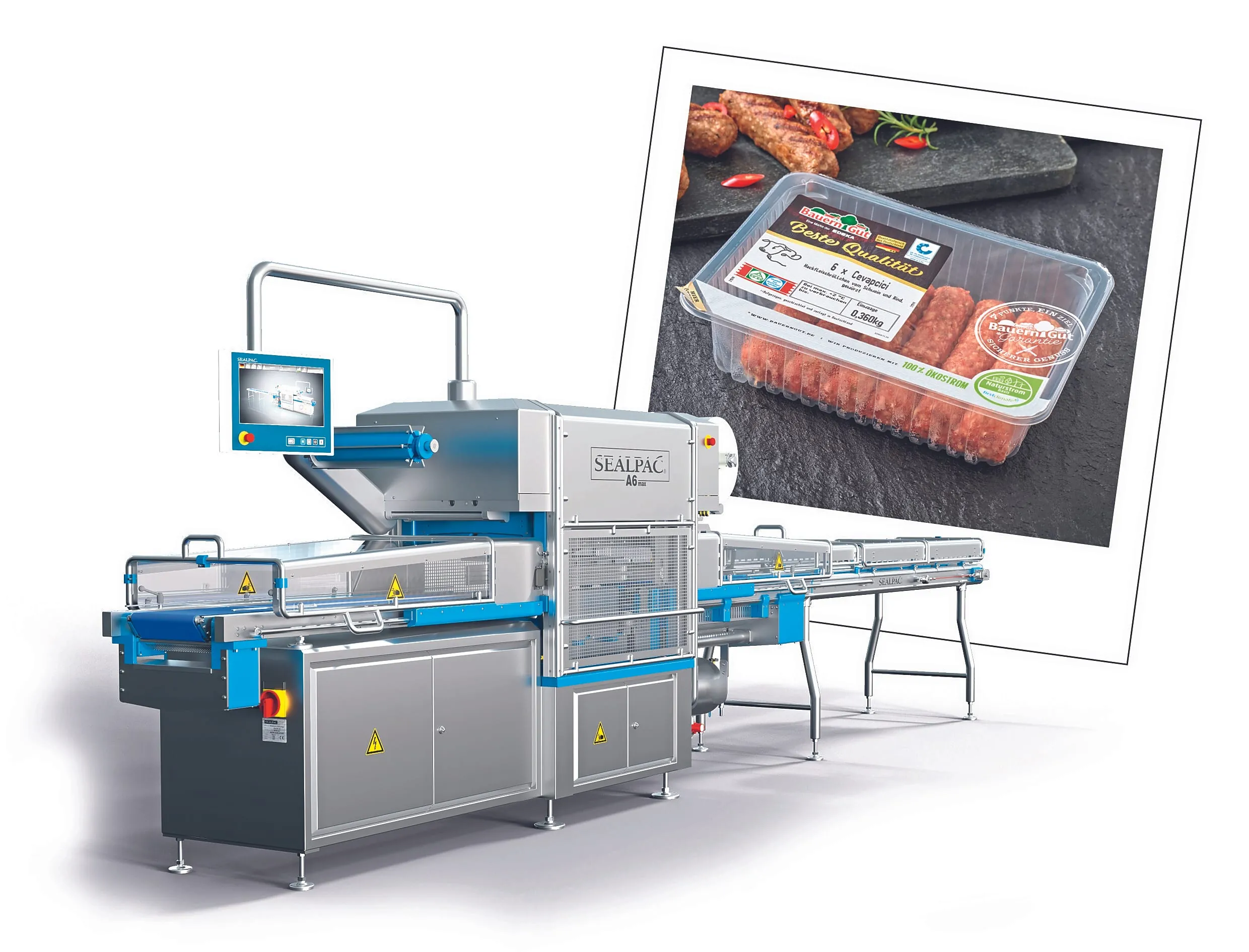 Dass sich Fresh-Food sicher und ressourcenschonend verpacken und gleichzeitig einladend präsentieren lässt, zeigt Sealpac am Beispiel der neuen Traysealer-Serie: Die A6max verarbeitet prozesssicher UltraLight-Schalen im Format 190 × 144 mm. Das Gewicht der Trays wurde im Vergleich zu herkömmlichen Schalen um 20 Prozent reduziert. Die UltraLight-Schalen lassen sich gut stapeln und präsentieren das Produkt appetitlich und ansprechend. Die Anlagen sind mit dem sogenannten EnergyManager ausgestattet, der den Energieeinsatz minimiert.