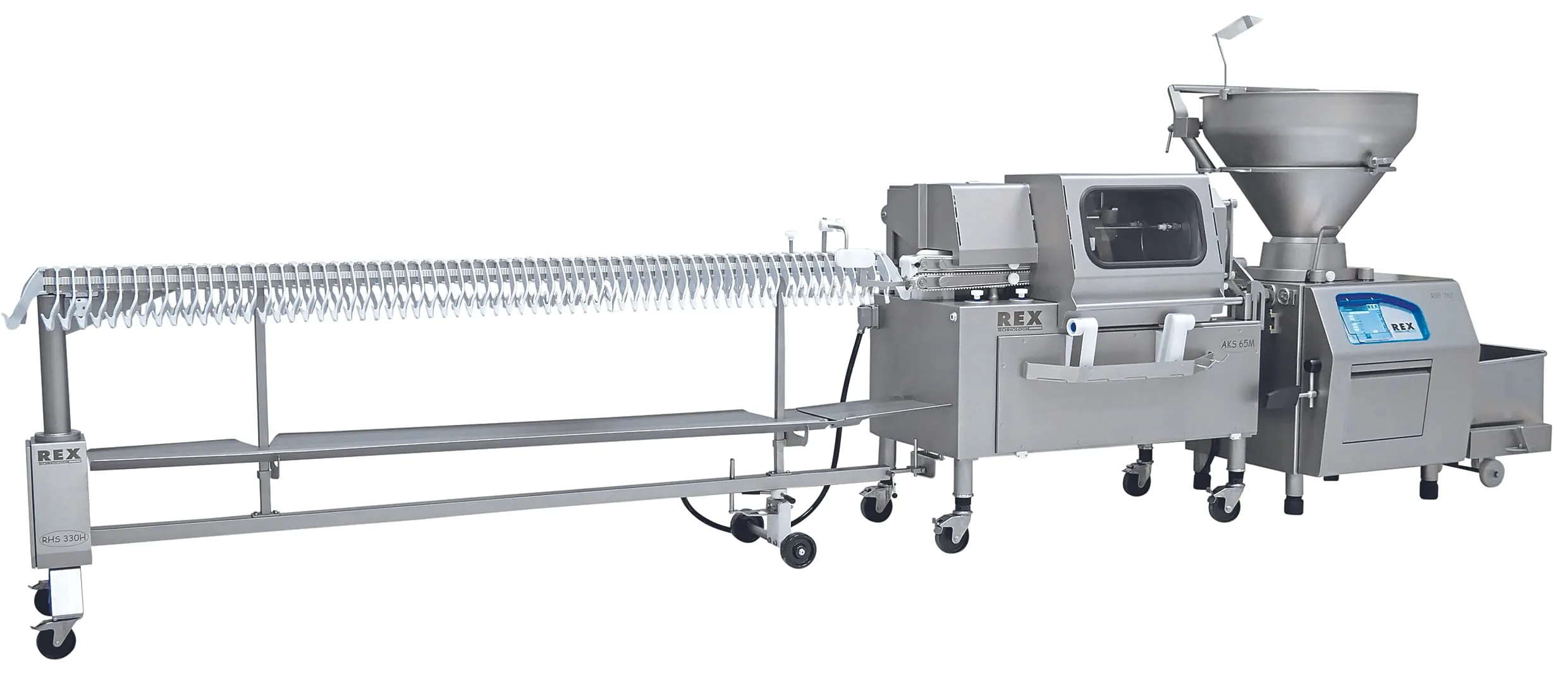 Egal ob Natur-, Kunst- oder Kollagendärme, die Abdreh- und Aufhängesysteme von Rex-Technologie, Thalgau/Österreich, füllen portionsgenau bei hoher Geschwindigkeit. Das Produkt wird über das Flügelzellenförderwerk des Rex-Vakuumfüllers schonend gefördert, die Restluft evakuiert. Die Darmraupenbeschickung auf das Abdrehrohr erfolgt automatisch über das Darmmagazin. Die Revolvertechnologie schafft mit drei Abdrehrohren einen Darmwechsel von unter zwei Sekunden.