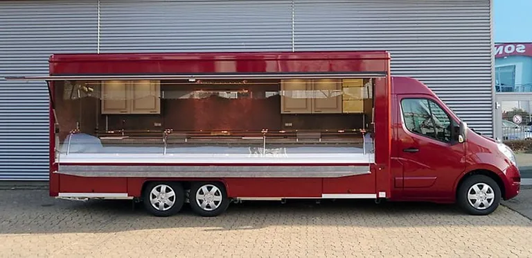 Das attraktive Innendesign der neuen Fleischmobile besticht durch seine Edelstahl- und Holzelemente, die optisch so aufeinander abgestimmt sind, dass die Warenpräsentation im Vordergrund steht. Rechtwinklige Thekenaufsätze gewähren einen optimalen Einblick auf die Thekenauslage, Ausschnittverglasungen mit sandgestrahlten Elementen und Kühlanlagen mit Leistungssteigerung bis 32° sind nur einige Neuheiten im mobilen Ladenbau.