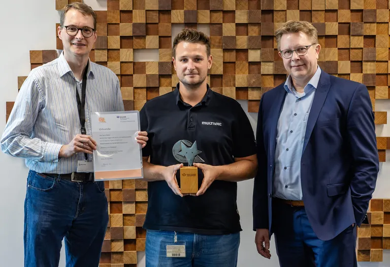 Übergabe des „Schlauen Fuchs“ (v.l.n.r.): Marc-Manuel Freitag (BGHM), David Walter (Multivac), Bernd Höpner (Multivac). - © Multivac