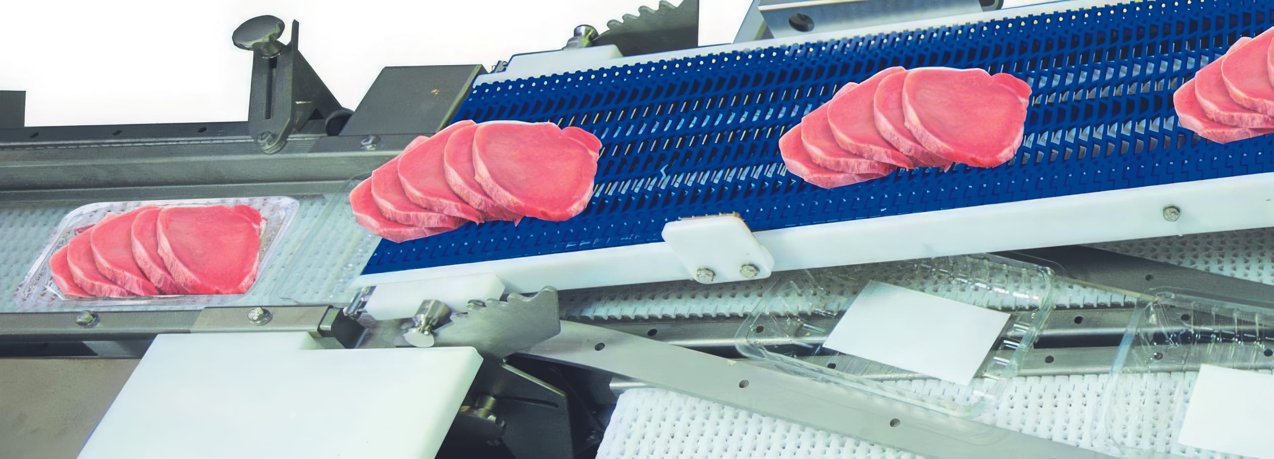 Nach dem Portionieren werden Trays automatisch mit den geschnittenen Fleischportionen befüllt. Eine Automation, die bis zu fünf Mitarbeiter pro Linie von einer ermüdenden Routinetätigkeit entlastet. Anschließend werden die Trays von einem Beschleunigungsband entzerrt und auf der Durchlaufwaage gewogen. Zu leichte oder zu schwere Portionen gelangen über Pusher auf einen Nacharbeitsplatz. Gutgewichtige Portionen werden zur Verpackungsmaschine geleitet, einem Traysealer.