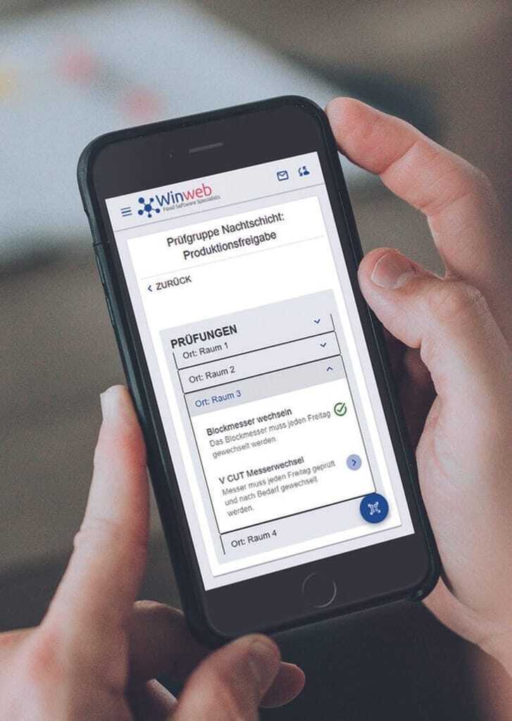 Die Winweb-QS-App für die be­triebs­interne Qualitätssicherung unterstützt bei Prüfungen und Rundgängen: Die Daten werden in den zu prüfenden Räumen erfasst, die Ergebnisse protokolliert und gespeichert. Dabei kann die App auch in Bereichen ohne Internet wie im Kühlhaus genutzt werden, da alles gespeichert wird. Besteht eine Verbindung zum Netz, wird synchronisiert. Eine nachträgliche Erfassung ist nicht nötig, Ausdruck und Ablage der Prüfverfahren, Ergebnisse und Berichte auf Papier gehören der Vergangenheit an.