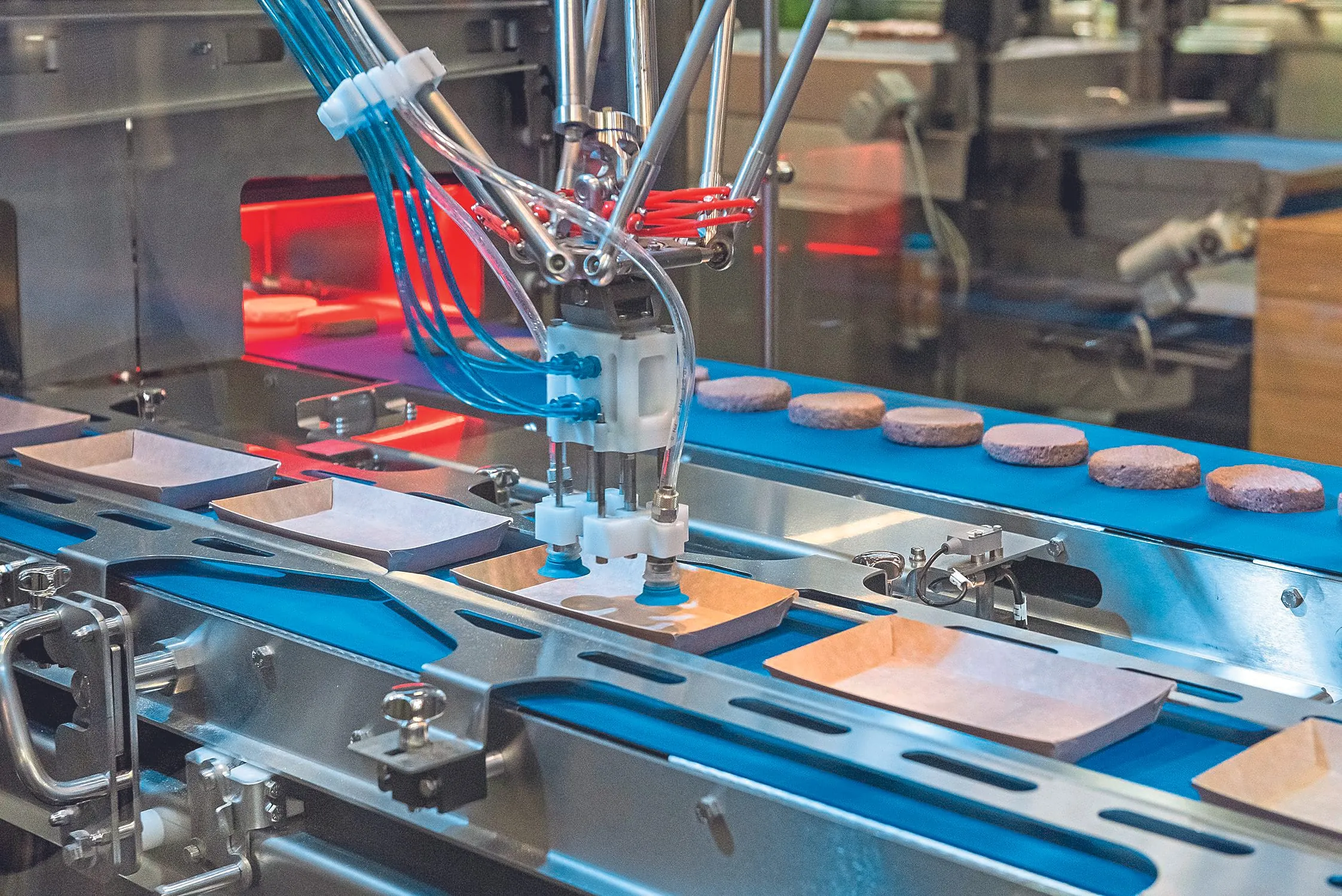 Industrieroboter sind mittlerweile auch in der Lebensmittelindustrie Standard, zumindest in größeren Betrieben. Rund um die Uhr im Einsatz, können sie erhebliche Effizienz- und Produktivitätsgewinne erzielen. Dabei ist der Übergang zwischen konventionellen Spezialmaschinen und solchen mit integrierter Robotertechnik fließend. Industrieroboter werden vor allem eingesetzt, um wiederkehrende Aufgaben zu übernehmen, wie sie typischerweise in der Fleischverarbeitung anfallen, beispielsweise schneiden, portionieren, verpacken, umhüllen, sortieren, aufnehmen oder platzieren.