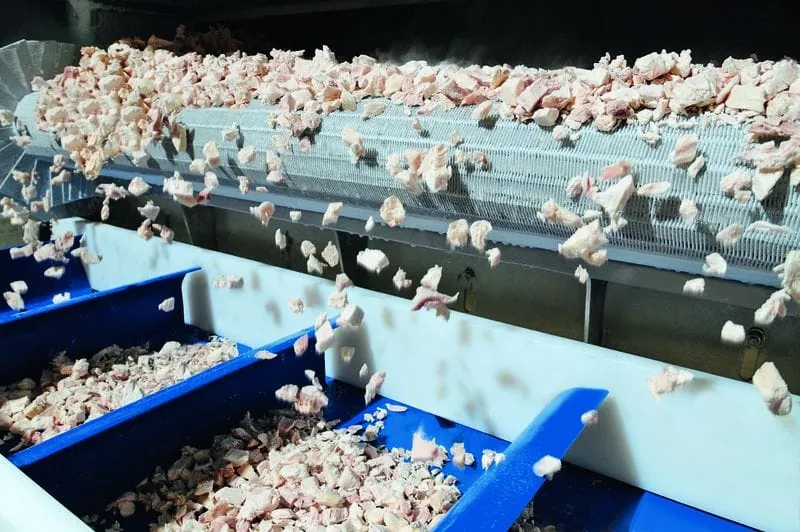 Tip Top Poultry’s specialties are so-called IQF products (“Individually Quick Frosted”), which are produced at the company’s site in Rockmart, Georgia. The frozen poultry parts are then used as ingredients in soups, salads, meat pies and other convenience foods. Cooked chickens are deboned, their meat filleted, cubed to a size of 0.6 to 2.5 cm and then loose frozen. The poultry cubes and smaller parts are then separately packaged for sale. Until now, three freezers operating on carbon dioxide (CO2) were used in Rockmart for freezing and packaging cubed chicken meat and other IQF products. These freezers supplied two packaging lines.