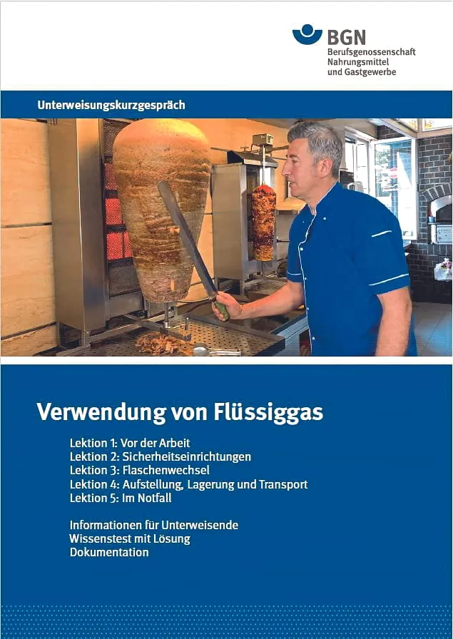 Ein erster Schritt, um dieses Problem anzugehen, ist die kurze Unterweisung „Verwendung von Flüssiggas“, zum Herunterladen auf der Internetseite „Wissen kompakt: Flüssiggas- und Erdgasanlagen“ der Berufsgenossenschaft Nahrungsmittel und Gastgewerbe (BGN). Der Zeitaufwand dafür ist gering, denn das „Unterweisungs-Kurzgespräch“ vermittelt komprimiert die wichtigsten Grundlagen für den unfallfreien Arbeitsalltag mit Flüssiggasanlagen – bildgestützt und für jedermann verständlich. Am besten führt man das Gespräch vor Ort, anschaulich an der eigenen Anlage.