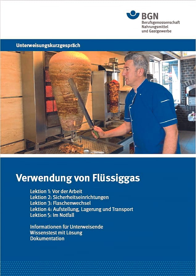 Ein erster Schritt, um dieses Problem anzugehen, ist die kurze Unterweisung „Verwendung von Flüssiggas“, zum Herunterladen auf der Internetseite „Wissen kompakt: Flüssiggas- und Erdgasanlagen“ der Berufsgenossenschaft Nahrungsmittel und Gastgewerbe (BGN). Der Zeitaufwand dafür ist gering, denn das „Unterweisungs-Kurzgespräch“ vermittelt komprimiert die wichtigsten Grundlagen für den unfallfreien Arbeitsalltag mit Flüssiggasanlagen – bildgestützt und für jedermann verständlich. Am besten führt man das Gespräch vor Ort, anschaulich an der eigenen Anlage.