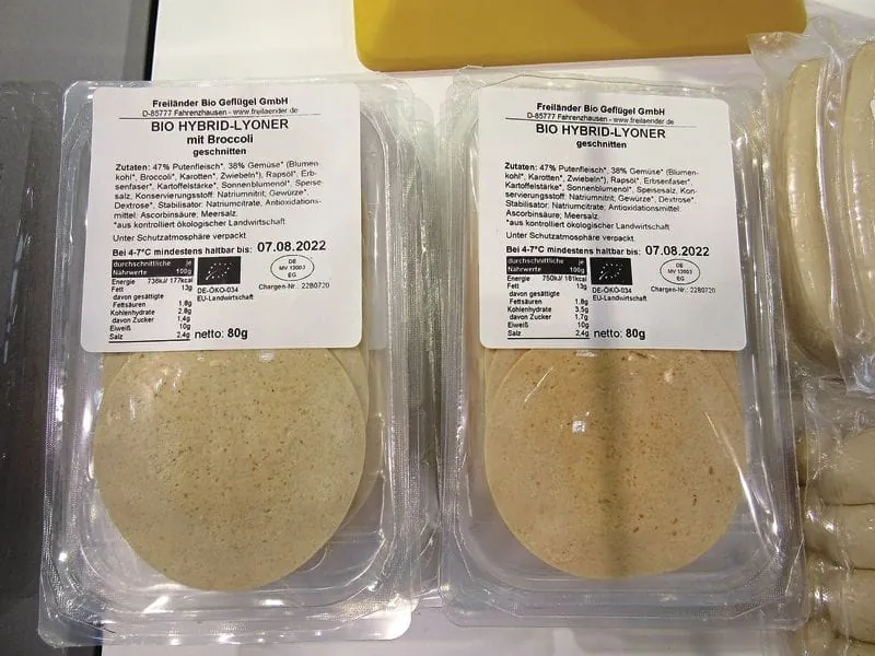 Für den konventionellen Einzelhandel sind Hybrid-Fleisch- und Wurstwaren keine Neuheiten, im Biobereich schon. Als Hybride gelten Produkte, bei denen ein Teil Fleisch durch Gemüse ersetzt wurde. Im Zuge dessen verändern sich weitere Zutaten in der Rezeptur. Der Verbrauchertrend hin zu weniger Fleisch und Wurst habe den Anstoß für die Entwicklung gegeben, berichtet Stefan Mutter, Geschäftsführer der Freiländer Bio Geflügel GmbH, die bis Februar unter Freiland Puten Fahrenzhausen firmierte. „Wir verarbeiten inzwischen mehr Hähnchen als Puten. Deshalb war es Zeit für einen neuen Namen“, erklärt er. In den Freiländer Hybriden macht Geflügelfleisch knapp die Hälfte des Gewichts aller Zutaten aus. Die Wurst trägt die geflügelhelle Farbe, Gemüse ist optisch nicht erkennbar. Bio Hybrid-Currybratwurst, -Lyoner und -Lyoner mit Brokkoli heißen die Erstlinge im SB-Geflügelwurstsortiment. Das auszubauen ist dem Geschäftsführer wichtig. Trotz einer Entwicklungszeit von mehreren Monaten sollen die Waren preislich wie die klassische Freiländer Bio-Wurst angeboten werden. Zielgruppe der Hybridprodukte sind Flexitarier, Menschen, die nicht auf Fleisch und Wurst verzichten, sondern es reduzieren wollen.