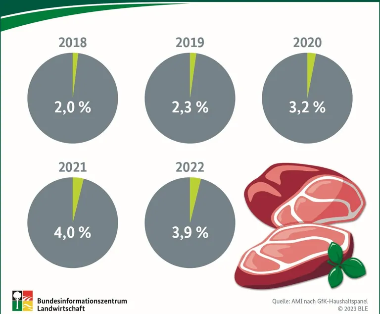 Dass Verbraucherinnen und Verbraucher zu Fleisch aus ökologischer Erzeugung greifen, ist nach wie vor die Ausnahme. 2022 stammten lediglich 3,9 Prozent des gekauften Fleisches aus biologischer Erzeugung. Nach Jahren stetigen Wachstums bedeutete dies gegenüber 2021 einen minimalen Rückgang – ein Trend, der 2022 bei fast allen Bio-Lebensmitteln zu beobachten war. Ein wichtiger Grund dafür sind die stark gestiegenen Lebensmittelpreise. www.ble.de