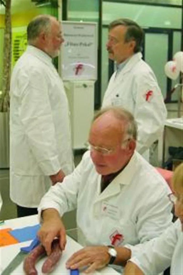 Mitten in der Innenstadt von Köln, im Foyer des Dumont-Karrees, fand die diesjährige Prüfung im Rahmen des Blutwurstwettbewerbs statt. Statt hinter verschlossenen Türen zu agieren, trat die Innung Köln mit der Beurteilung der über 250 eingereichten Blutwurstproben bewusst an die Öffentlichkeit. Geschäftsführer Artur Tybussek: „Jeder soll wissen, dass wir im Handwerk nichts zu verbergen haben.“ Umrahmt von den Kölner Fleischersängern machte die Innung ein publikumswirksames Event daraus. Auch DFV-Präsident Manfred Rycken zeigte sich begeistert von der Art und Weise, wie die diesjährige Prüfung inszeniert wurde. Schirmherr des Wettbewerbs war der Präsident der Handwerkskammer zu Köln, Franz-Josef Knieps. Die Königskategorie „Spitzenqualität“ gewann Karl-Heinz Esser aus Erkelenz-Lövenich, der Pokal für die „mittlere Qualitätsstufe“ ging an die „Nettesheimer Rotwurst“ der Metzgerei Josef Telmes aus Rommerskirchen und erneuter Sieger in der Kategorie „einfache Blutwurst“ wurde Elmar Diedrich (Metzgerei Brandt, Leichlingen).Rainer Heck