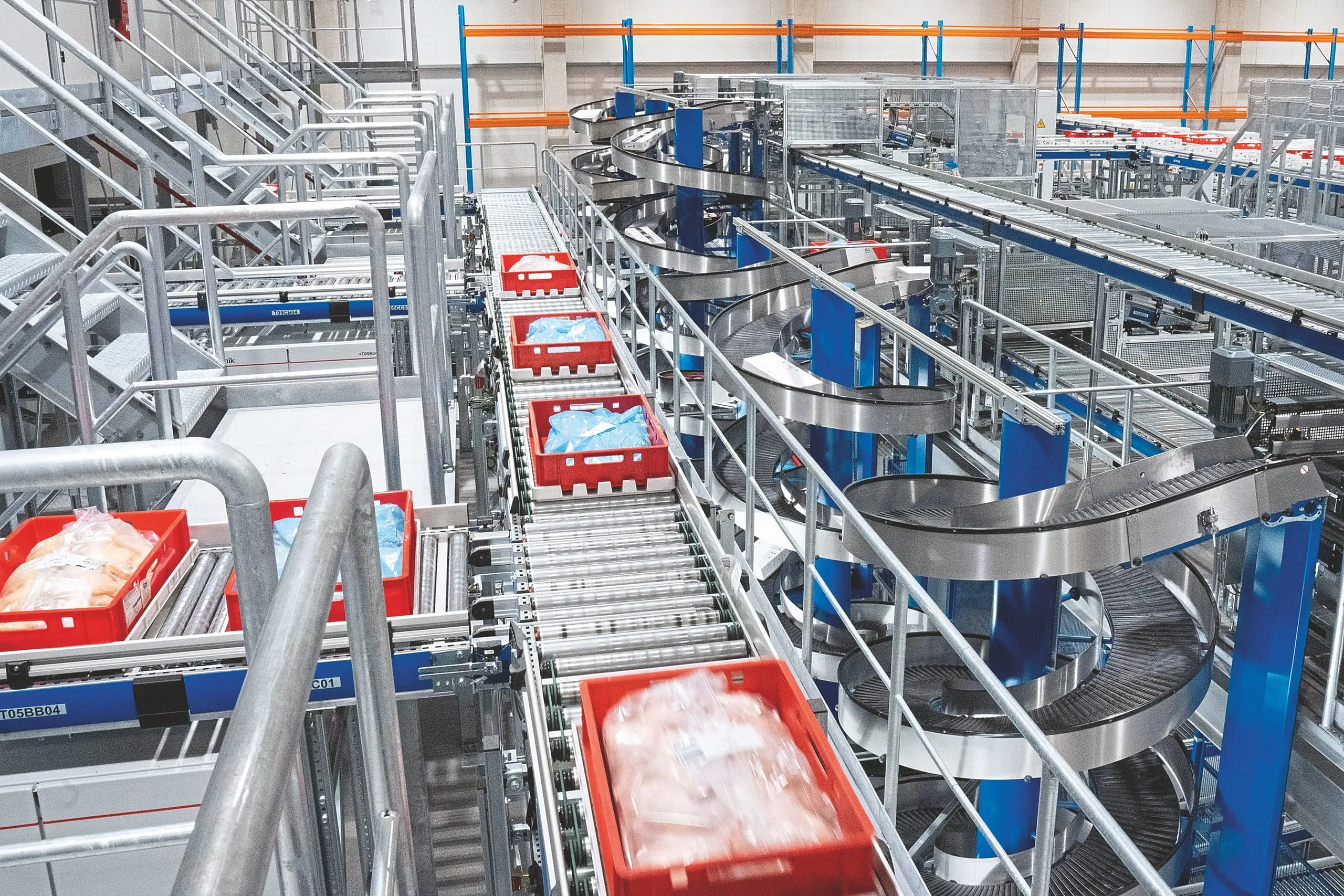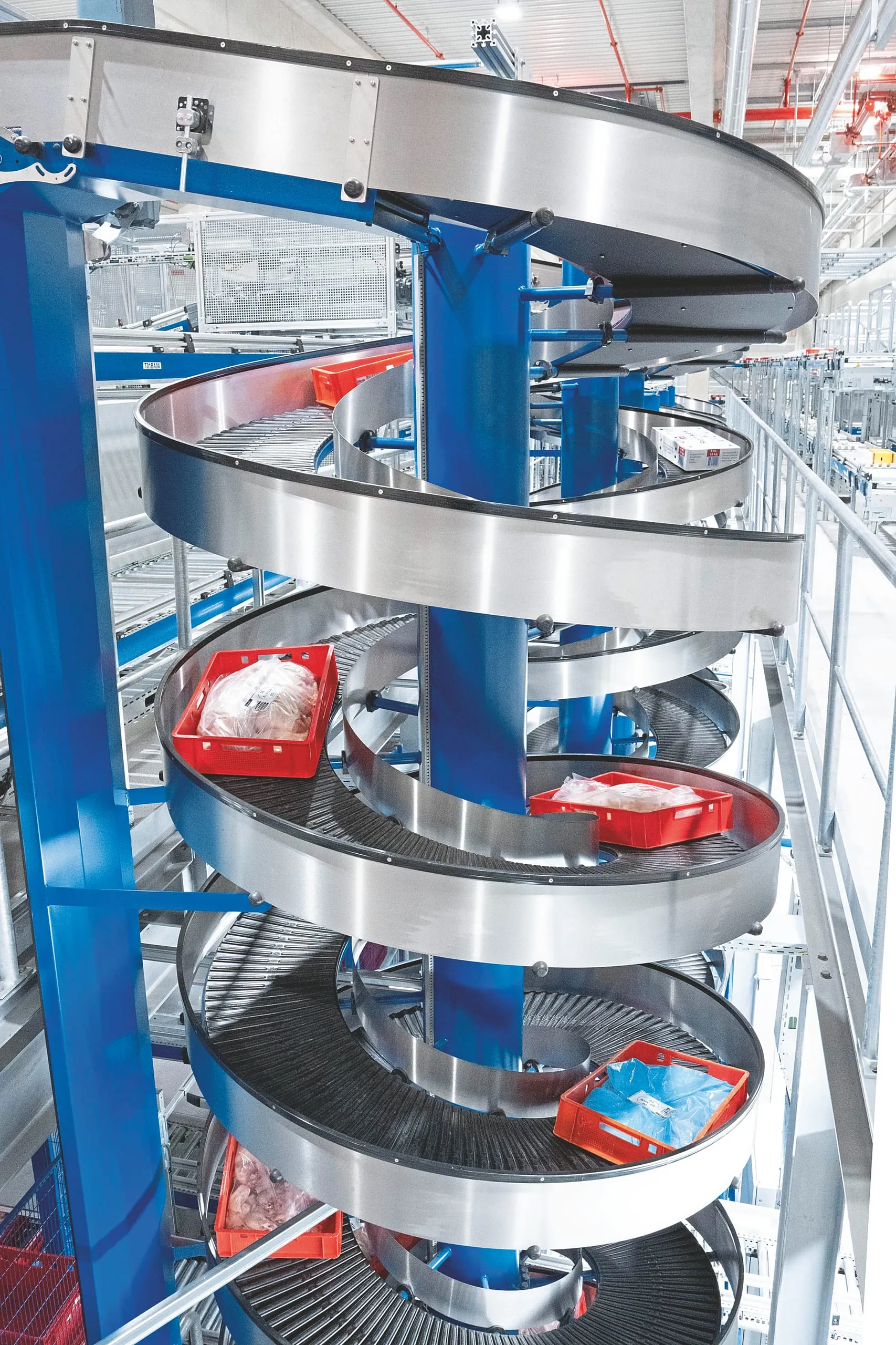 Die Warenträger werden über Spiralförderer an die Arbeitsplätze geleitet. Unitechnik
