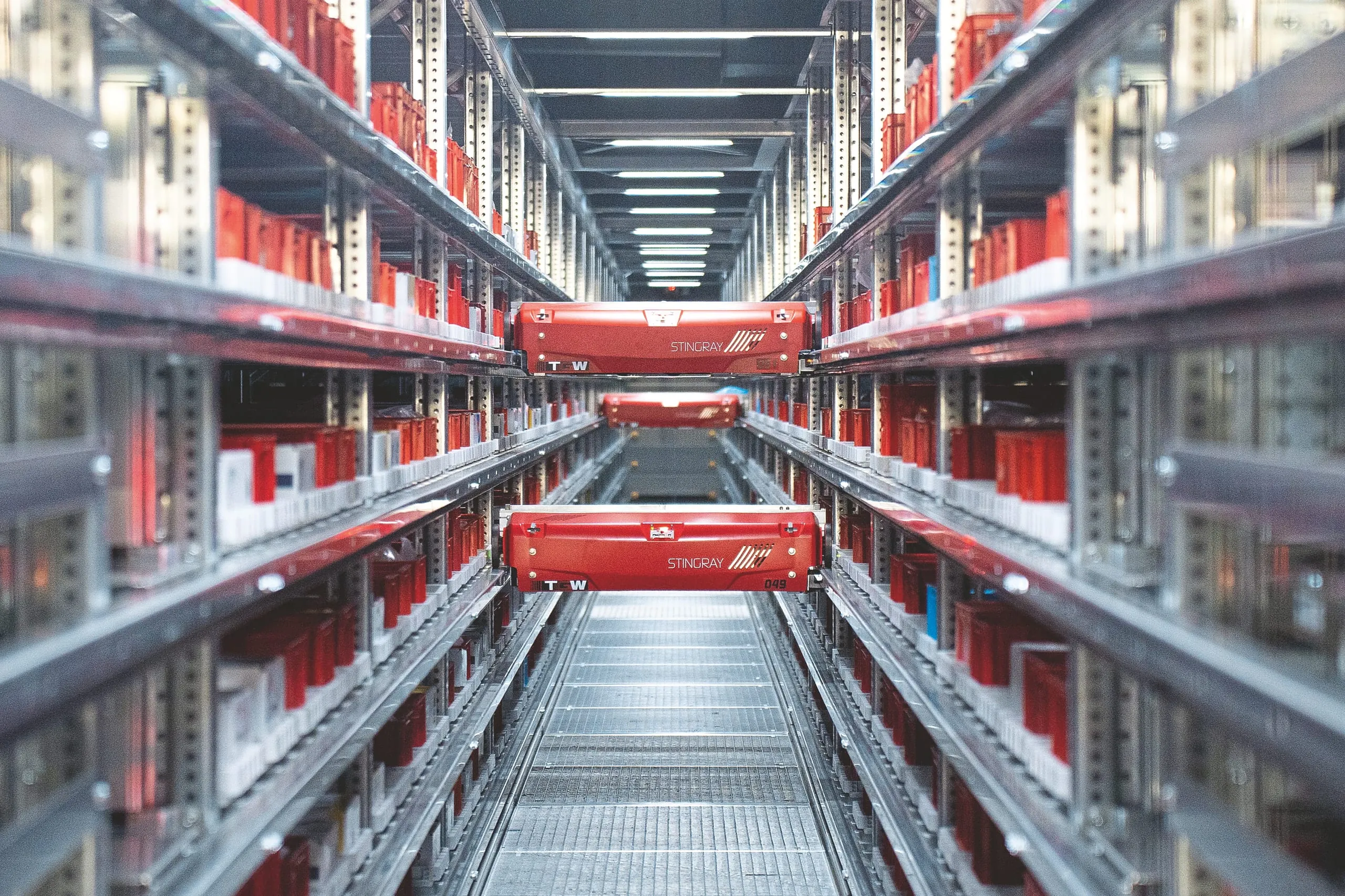 Kernstück der neuen Anlage ist ein hochautomatisiertes Shuttlelager mit 31.200 Behälterstellplätzen. Vier Gassen mit jeweils 26 Ebenen und insgesamt 104 Shuttle-Fahrzeugen ermöglichen eine hochdynamische und sequenzierte Ein- und Auslagerung – mit einer Leistung von je etwa 3.000 Behältern pro Stunde.