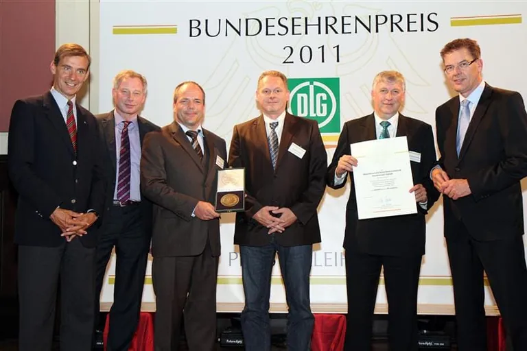 Gemeinsam mit dem Parlamentarischen Staatssekretär Dr. Gerd Müller übergab der Präsident der DLG (Deutsche Landwirtschafts-Gesellschaft), Carl-Albrecht Bartmer, Urkunde und Medaille an den Geschäftsführer Dr. Karl Horst Gehlen; Uwe Klünder, Leiter Marketing; Stefan Schmelz, Leiter Produktion und Verpackung und Thorsten Unland, Leiter Qualitätssicherung.