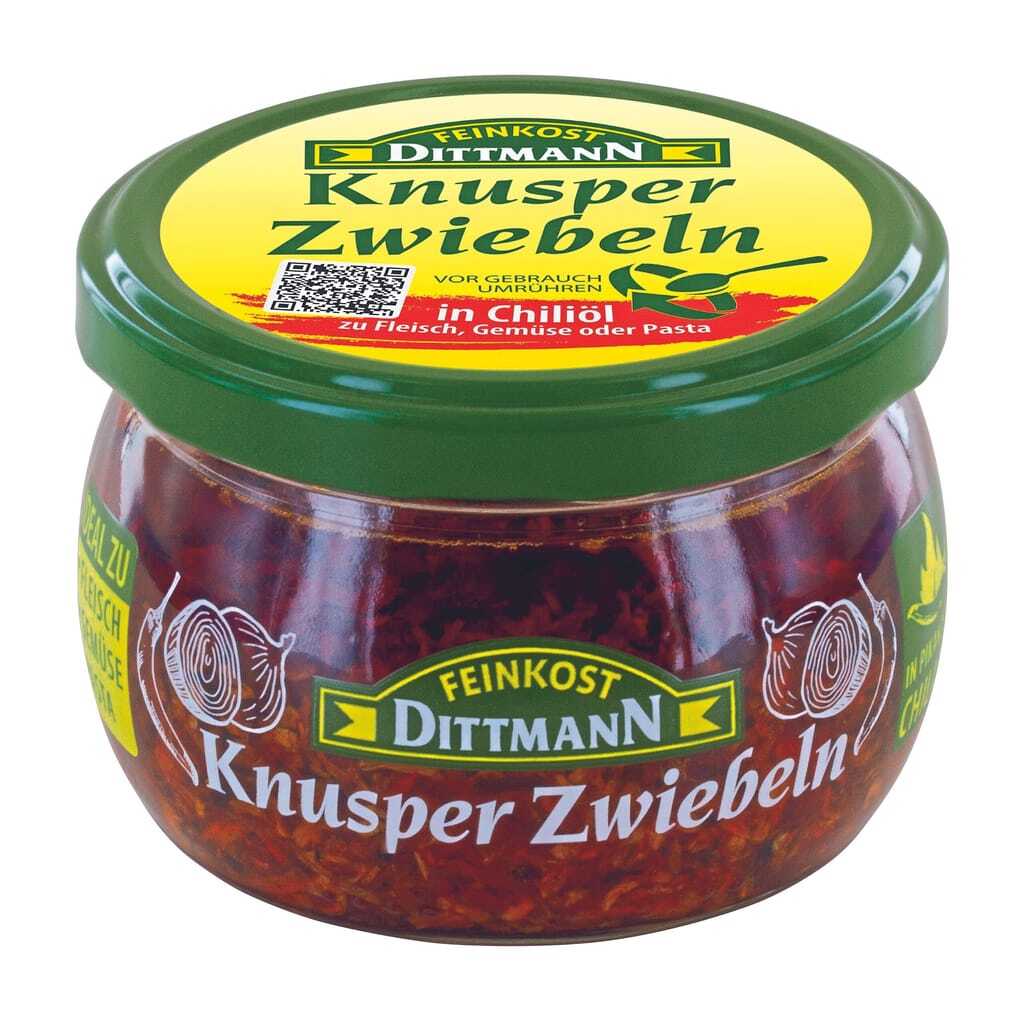 Die Knusper Zwiebeln (im 185g Glas) von Feinkost Dittmann, Diez, eignen sich auch hervorragend zum Grillen. Verfeinert mit Chili-Öl sorgen sie für ein pikant-scharfes Geschmackserlebnis.