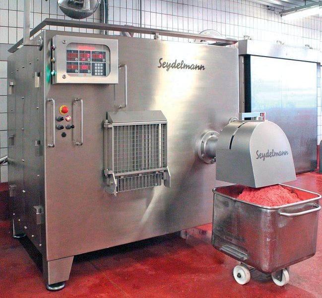 Frozen meat grinders from Seydelmann (Stuttgart, Germany) cut whole blocks of frozen meat into pieces that can easily be handled by cutters, which enables efficient further processing. Optimal grinding achieves the best possible feed into the cutter. Frozen blocks are ground in two steps. The robust worm, with its elongated winding, peels off about 8 cm from the frozen block at every turn. This pre-cut material is then transported to the blade set for further cutting. The frozen meat grinders have a two-speed drive and are also suitable for grinding other frozen food products such as fish, vegetables, cheese and fruit.