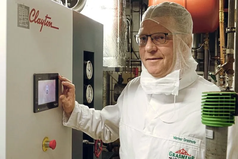 Grasmehr kam es beim Umstieg auf einen anderen Dampferzeuger darauf an, sowohl den aktuellen Bedarf abzudecken als auch für zukünftige Produktionsausweitungen gerüstet zu sein. Außerdem mussten die minimalen Platzbedingungen im kleinen Kesselhaus berücksichtigt werden. Was für den Vorgängerkessel galt, war dieses Mal tabu: Für den Einbau durfte keine Wand aufgestemmt werden, auch weil es keine Zeit für entsprechende Baugenehmigungen gab. Aufgrund ihrer kompakten Bauweise passten am Ende sogar zwei Steam Master von Clayton durch die Tür ins kleine Kesselhaus.