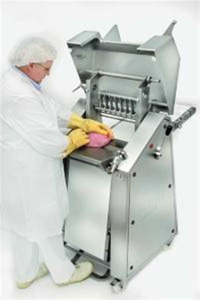 Das V-Modell ist durch die federnd gelagerte Andruckwalze auch zum Durchlauf von hohen Teilstücken geeignet. Die ESB 4434 V hat eine Schnittbreite von 434 mm. Sie ist Herstellerangaben zufolge aus 3 mm starkem Edelstahl gefertigt, hochwertig verarbeitet und dadurch sehr robust und langlebig. Die Version ESB V/1 ist zusätzlich mit einem Abfuhrband zum vereinfachten Abtransport der bearbeiteten Teilstücke ausgestattet.Halle 8, Stand C 32