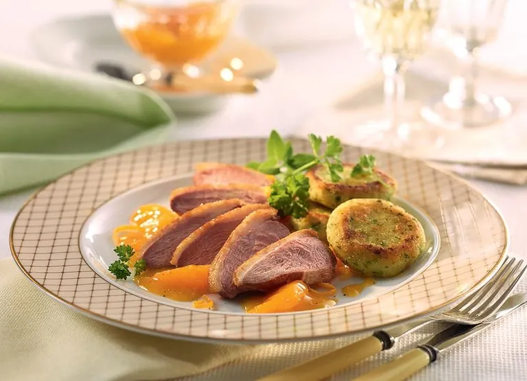 Glasierte oder gefüllte Ente ist ein beliebtes Festtagsessen, denn das Fleisch bietet einen besonders feinen Geschmack. Neben dem klassischen Entenbraten sorgen Teilstücke wie die Entenbrust oder -keule für besonderen Genuss, wie etwa bei dem Rezept „Entenbrust à l‘orange mit Kartoffel-Kräuter-Talern“.