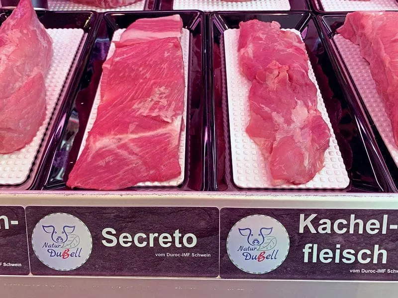 In der Metzgerei Bellendorf in Lembeck kaufen die Kunden wieder größere Fleischstücke. Ein Grund dafür: Hinter der neuen Fleisch-Eigenmarke „Natur DuBell“ steckt die Zuchtlinie des Duroc IMF. Die komplette Wertschöpfung vom Ferkel bis zur Theke liegt in der Hand des Fleischers.