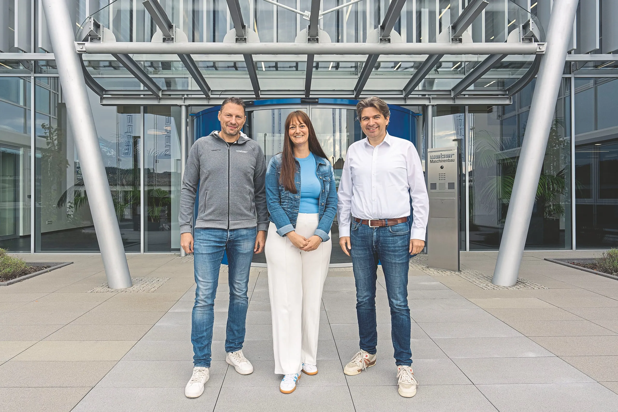 Bei der Spendenübergabe (v.li.): Christian Hartmann (Weber), Esther Mara Junker (Kinder- und Jugendhospiz Balthasar), Tobias Weber (Weber). - © Weber Food