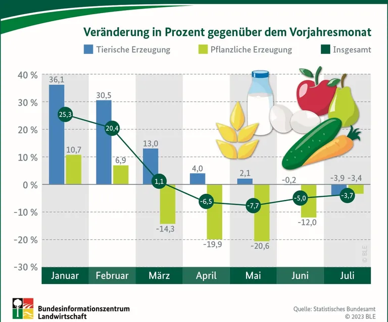 Während die Verbraucherpreise weiter steigen, ist bei den Erzeugerpreisen landwirtschaftlicher Produkte eine Trendwende zu erkennen. Die Erzeugerpreise lagen im Juli 2023 um 3,7 Prozent niedriger als im Juli 2022 und damit den vierten Monat in Folge unter dem jeweiligen Vorjahresniveau. Das liegt vor allem am sehr hohen Preisniveau im Jahr 2022.