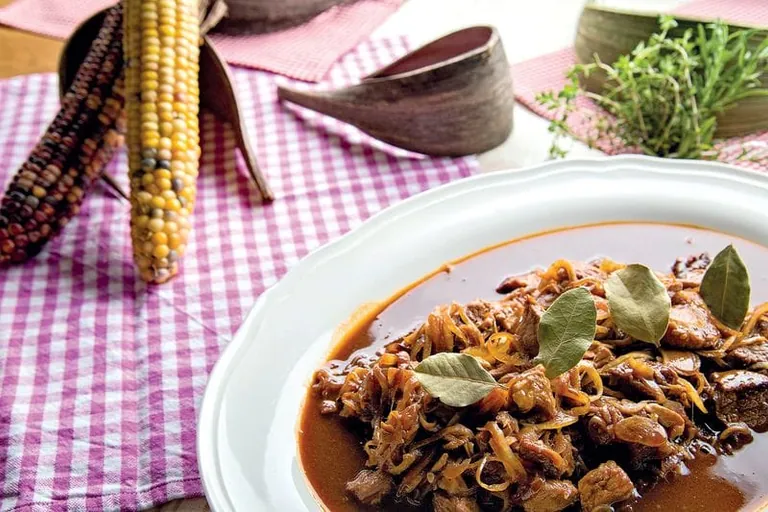 Das Fett in einem tiefen Topf zerlassen, das Fleisch bei großer Hitze darin anbraten, bis es ringsum braun ist. Aus dem Topf nehmen, die Hitze reduzieren, die Zwiebeln im Fett glasig dünsten (aber nicht braun werden lassen!).