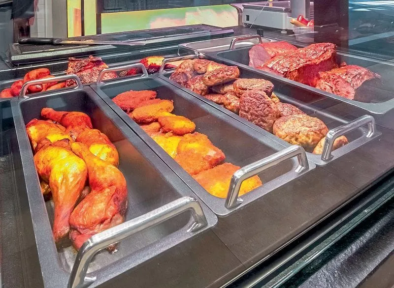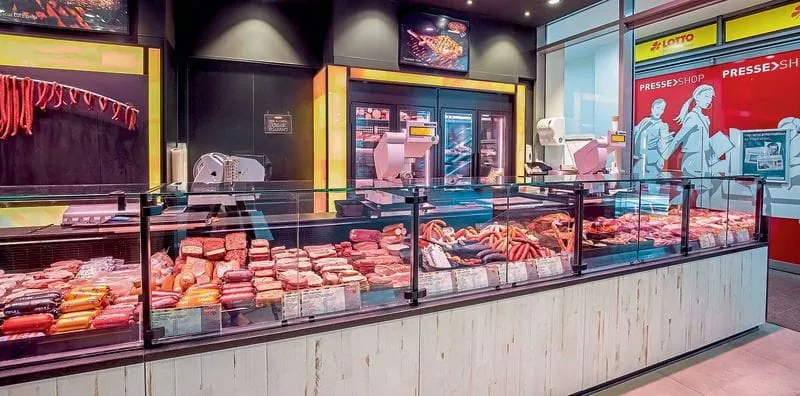 Dass die vielen Plätze auch tatsächlich zum Verzehr und nicht nur zum Chillen genutzt werden, hat die Planung vorherbestimmt: Der Hauptzugang zum „ESszimmer“ liegt direkt neben der Heißtheke. Die Renner hier sind die Klassiker des Metzgerimbises: Fleischkäs-Weck, Fleischküchle, Schnitzelsandwich. Damit der Fleischkäse aus der Häfele-Eigenproduktion auch optisch als etwas Besonderes wirkt, liegt er auf der „Platte 74“. Das ist die Weiterentwicklung der Heißen Theken vom Ladenbauer Aichinger. Diese Imbisspräsentation braucht kein Wasserbad, verursacht keine vom Wasserdampf beschlagenen Scheiben und kann mit verschiedensten Töpfen, Pfannen oder eben direkt mit dem Produkt belegt werden.
