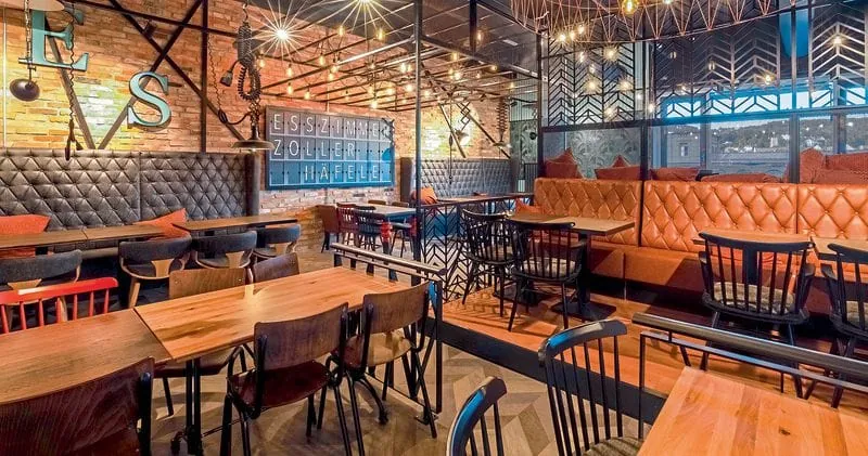 Der Verzehrbereich heißt „ESszimmer“. Dieser Markenname ist eine Idee von Konzeptberater Daniel Schwarz (Aichinger). Und dieser Name ist Programm. „ESszimmer“ steht für ein 300-m2-Loft, das aussieht wie ein Projekt der Zeitschrift „Schöner Wohnen“. Da sind unterschiedliche Stühle, verschiedenste Bänke, Ledersofas zum Reinlümmeln und ein großes Stufen-Sitzpodest mit Panoramablick auf den neu gestalteten Esslinger Bahnhofsplatz. Inmitten des stylischen Industriedesigns stehen große Kunstbäume und Skulpturen, die Wände sind mit fantasievollen Tapeten oder mit Backstein gestaltet. Zu den 150 Sitzplätzen im „ESszimmer“ kommen noch die Steh- und Hockplätze im Erdgeschoss sowie 60 Sitzplätze im Freien.