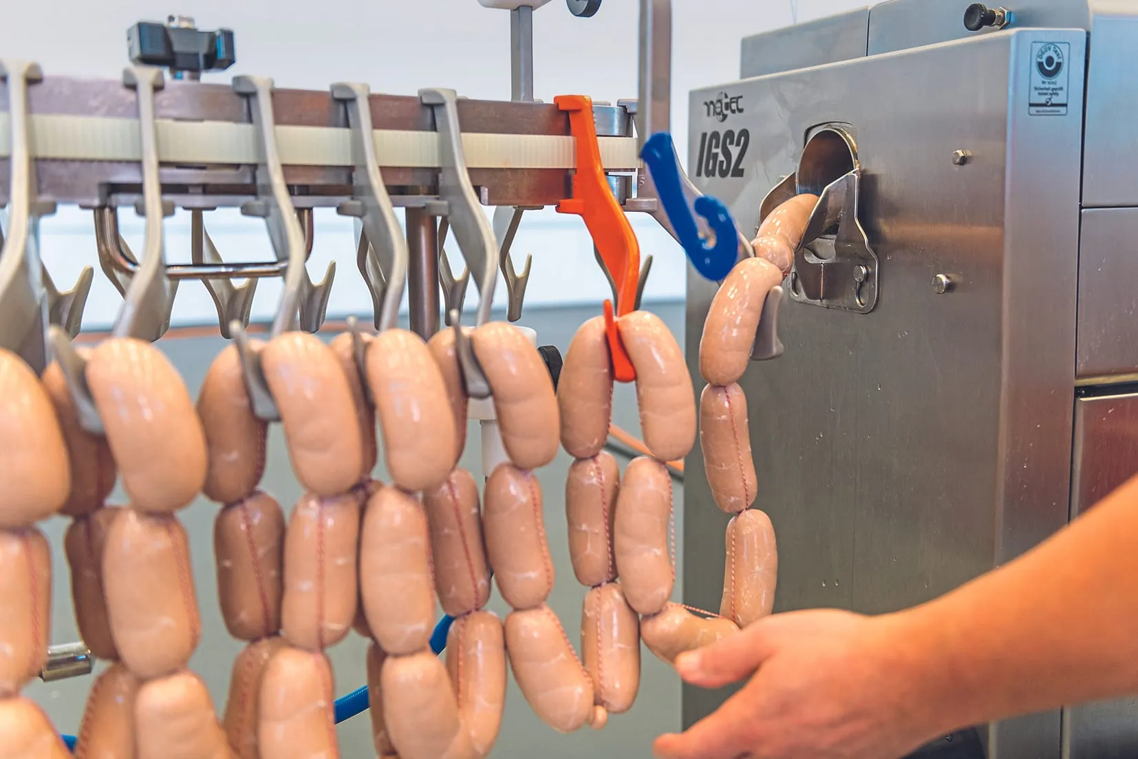 Mit der PTH-Linienlösung können Produkte in Natur- und Collagendarm im Kaliber von 28 bis 45 mm hergestellt und ab 4er-Loops in variablen Gruppen an die Aufhängeeinheit übergeben werden. Die abgebundenen Würste werden an der Abbindestelle in flexiblen Haken- und Gruppenabständen auf die Aufhängeeinheit gehängt. Von hier werden die Produkte, wie beispielsweise Regensburger, Sardelki oder Špekáčky einfach auf einen Rauchstock übernommen und einer thermischen Behandlung zugeführt. Der definierte Abstand der einzelnen Portionen durch die Aufhängeeinheit sichert zusätzlich ein gleichmäßiges Räucher- und Kochergebnis.