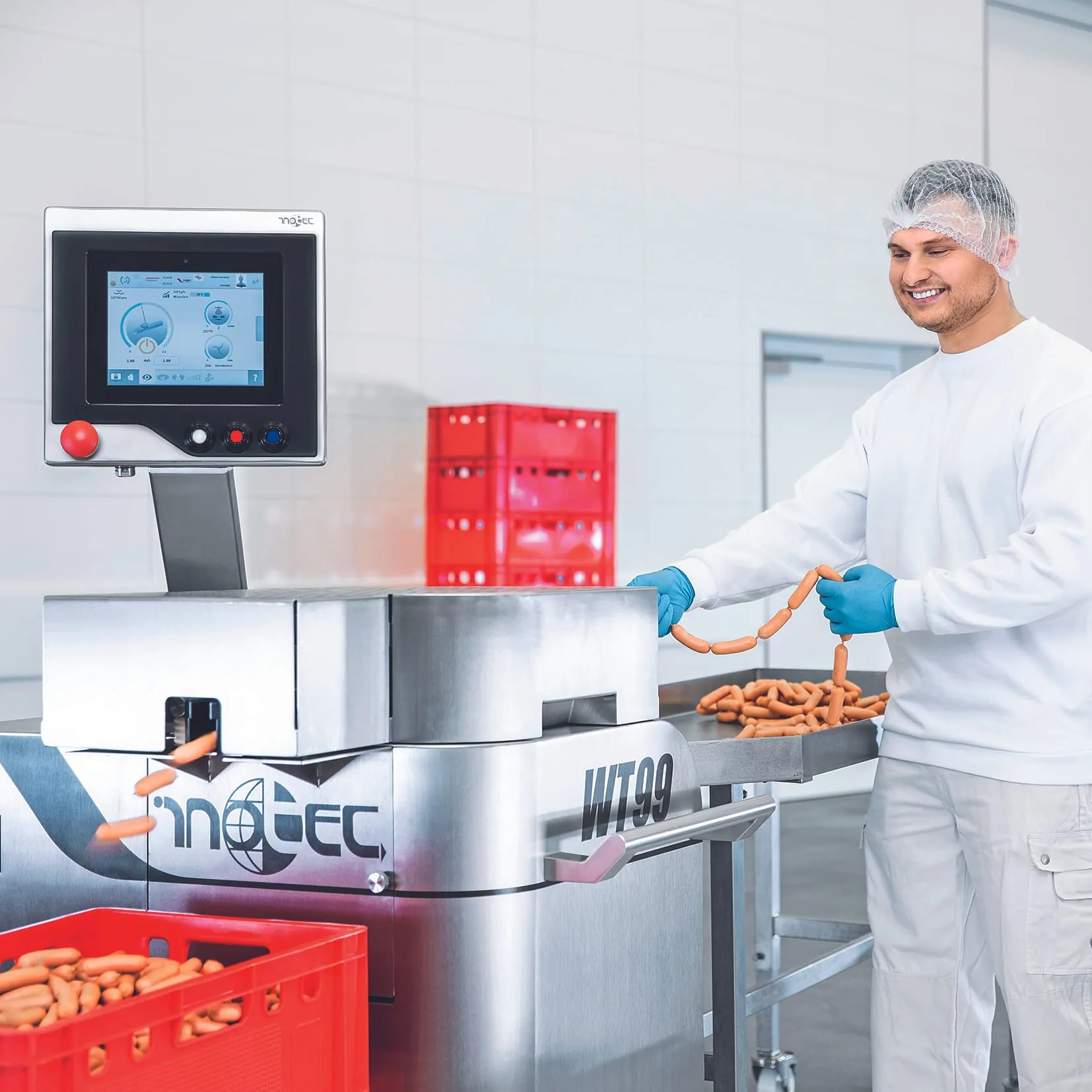 Der Produktionsprozess von abgebundenen Würsten ist nach der thermischen Behandlung, wie beispielsweise dem Räuchern, noch nicht abgeschlossen. In der Regel müssen die Produkte in eine gewünschte Stückzahl getrennt oder komplett vereinzelt werden. Handtmann Inotec bietet Wursttrenntechnologie speziell für abgebundene Produkte. Die WT99-iT C Wursttrennmaschine verarbeitet abgebundene Wurstprodukte im Natur-, Collagen- und Kunstdarm und deckt dabei einen großen Kaliberbereich von 15 bis 56 mm ab. Herzstück ist die patentierte Doppel-Sensor-Technologie, mit der eine automatisierte und zuverlässige Erkennung der Abdrehstelle gewährleistet wird und somit dem dreischneidigen Sichelmesser einen präzisen Schnittpunkt vorgibt. Das WT99-iT C Modell trennt alle Bindfäden sicher und schnell durch die vollautomatische Schnittpositionierung auf Basis der Doppel-Sensor-Technologie.