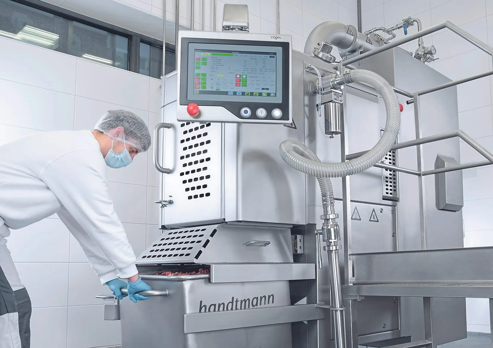 Über die Qualität der abgebundenen Endprodukte entscheidet auch die Produktvorbereitung. Relevant sind hier Faktoren wie Mischzeiten, Produktschonung und Homogenität der Produktmasse. Die Mischtechnik von Handtmann Inotec ist flexibel für zahlreiche Anwendungsgebiete einsetzbar. Äußerst kurze Mischzeiten, eine schonende Verarbeitung und optimale Homogenität der Produktmasse sowie eine extrem schnelle Entleerung mit nur kleinsten Restmengen zeichnen zum Beispiel das Modell VarioMix aus. Mit der Maschine ist sowohl hochintensives als auch sanftes Mischen möglich, angepasst an die jeweiligen Erfordernisse des Wurstproduktes. Ermöglicht wird dies durch die Mischspiralen des Mischers, die in individuell angepassten Wellenkonfigurationen arbeiten und die unabhängig voneinander in der Geschwindigkeit und in der Drehrichtung regelbar sind.