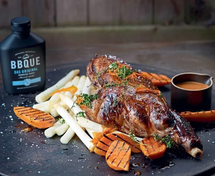 Spargel und Lammfleisch sind in der Saison ein bewährtes Doppel. Für Farbe und Raffinesse im Fleischerimbiss sorgt das orange Trendgemüse Süßkartoffel. Ein idealer Begleiter für gegrillte Lammkeule mit BBQ-Hollandaise und weißem Spargel.