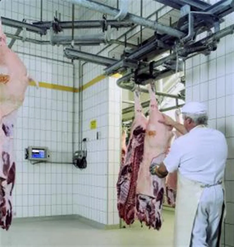 Beim Wareneingang erfasst eine Hochbahn waage alle relevanten Daten des Schlachtkörpers und stellt sie dem Warenwirtschafts system zur Verfügung.