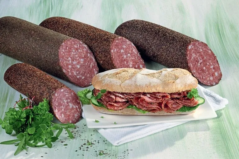 NaloSpice ist lieferbar als genähte Abschnitte, als Rollenware und als Bögen. Der Vorteil der funktionellen Hülle: Sie ersetzt ganze Produktionsschritte in der Wurstherstellung, indem sie Gewürze und Geschmack von der Hülle direkt auf die Oberfläche der Füllung überträgt.