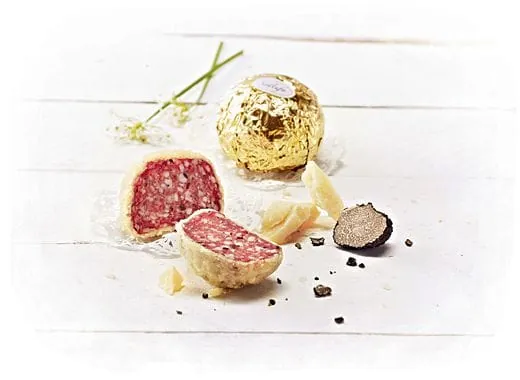 Die raffinierte Verbindung der erlesensten Rohstoffe ist das Geheimnis von Saltufo Gold: Feine Kugeln einer ganz besonderen Salami-Spezialität aus Schweinefleisch und echten Sommertrüffeln werden einem besonderen Naturreifeverfahren unterzogen und mit landestypischem, geraspeltem Parmigiano Reggiano umhüllt. Auch die Handhabung von Saltufo Gold ist einzigartig. Sie wird vom Endverbraucher mit dem Messer direkt am Tisch frisch aufgeschnitten, kann aber auch mit einem Hobel hauchdünn über Nudeln, Kartoffeln oder Risotto gerieben werden.