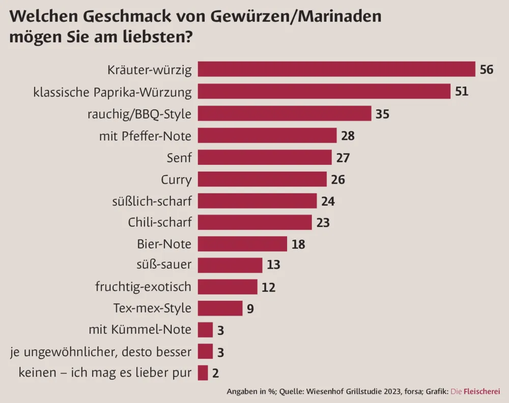 Beliebteste Geschmacksrichtung bei Marinaden ist nach wie vor „Kräuter-würzig“ (56 %), gefolgt von klassischer Paprika-Würzung (51 %) und „BBQ-Style“ (35 %). Mit 28 Prozent liegen Pfeffer-Marinade und Pfeffer-Gewürz auf Platz vier, knapp vor dem Senf-Geschmack mit 27 Prozent, der insbesondere in Ostdeutschland (46 %) überdurchschnittlich beliebt ist. Es folgen Curry-Geschmack (26 %) und schärfere Varianten mit Chili, wobei Sweet-Chili- (24 %) und richtig feurig scharfe Chili-Geschmacksrichtungen (23 %) etwa gleichauf liegen. Männer bevorzugen dagegen deutlich häufiger als Frauen eine Chili-Schärfe (31 % zu 16 %), eine Pfeffer-Note (37 % zu 19 %) und den rauchigen BBQ-Geschmack (41 % zu 29 %) als das weibliche Geschlecht. Ansonsten liegen die weiblichen und männlichen Geschmäcker relativ dicht beieinander.