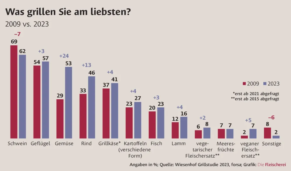 Schweinefleisch (62 %) ist während der Grillsaison noch immer das beliebteste Grillgut der Deutschen. Dahinter folgen Geflügel (57 %) und Gemüse (53 %). Rind landet bei 46 Prozent der Befragten auf dem Grill. Allerdings ist die Beliebtheit von Schweinefleisch seit Jahren tendenziell rückläufig: 2021 lag sie noch bei 63 Prozent, 2009 sogar bei 69 Prozent. Geflügel konnte im Vergleich zu 2009 um drei Prozentpunkte zulegen.