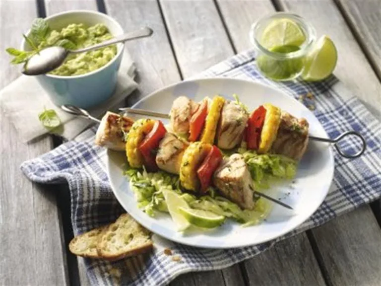 Grillspieße - wie in diesem Rezept mit Mais, Paprika und voher marinierten Hähnchenwürfeln - sind bei Verbrauchern sehr beliebt. Mit einem knackigen Spitzkohlsalat und aromatischem Avocado-Dip auf den Tisch gebracht, ist das eine leckere Rezeptidee für ernährungsbewusste Genießer.