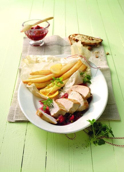 Das Hähnchenfleisch aufschneiden und mit Kompott und Spargel servieren.