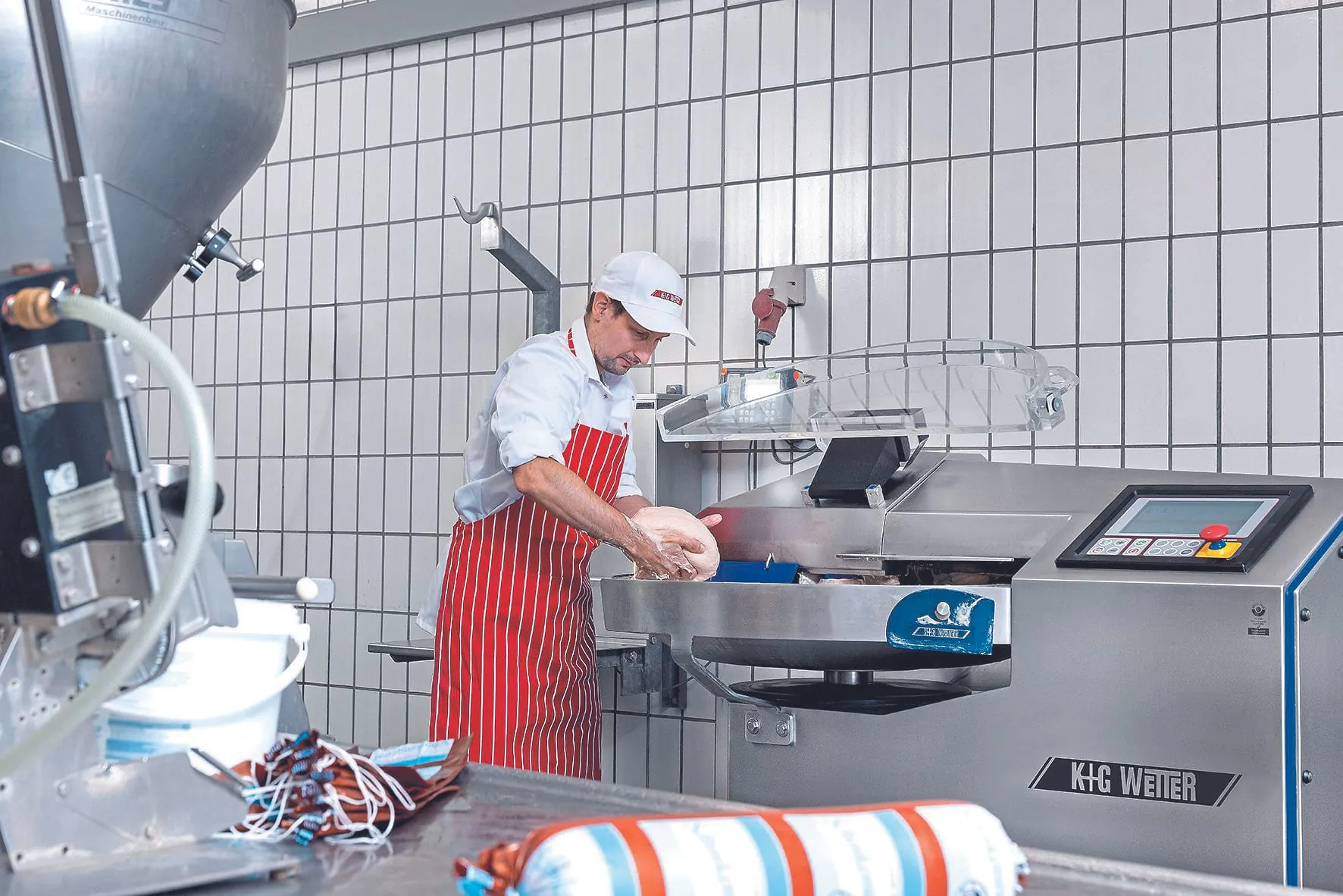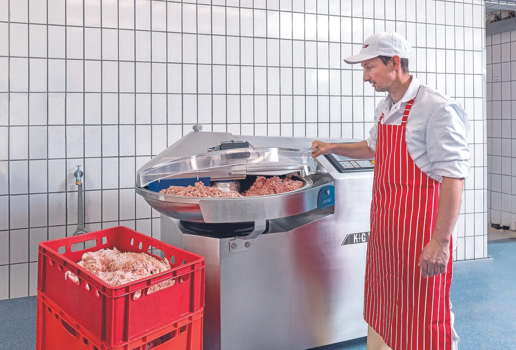 Seit Oktober 2023 tut die Maschine ihren Dienst in der Landes-Wurstproduktion. Gerade holt Thomas Landes die vorbereiteten Zutaten aus dem Kühllager: Grundbrät steht auf dem Produktionsplan. Aus Fleisch, Speck, Eis und Gewürzen entsteht die Basis für verschiedene Sorten an Brühwurst. Zum Befüllen öffnet Mitarbeiter Georgios Theodoru den Deckel des Kutters auf Knopfdruck elektrisch. Ein Feature, das Tag für Tag viel Hebearbeit spart. „Bei einem Kutter dieser Größe haben wir das auch nur bei K+G Wetter gesehen“, freut sich Thomas Landes über die Arbeitserleichterung.