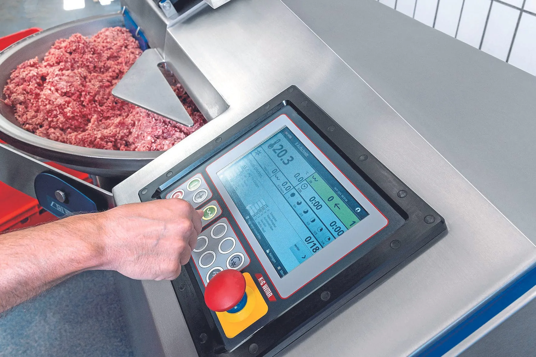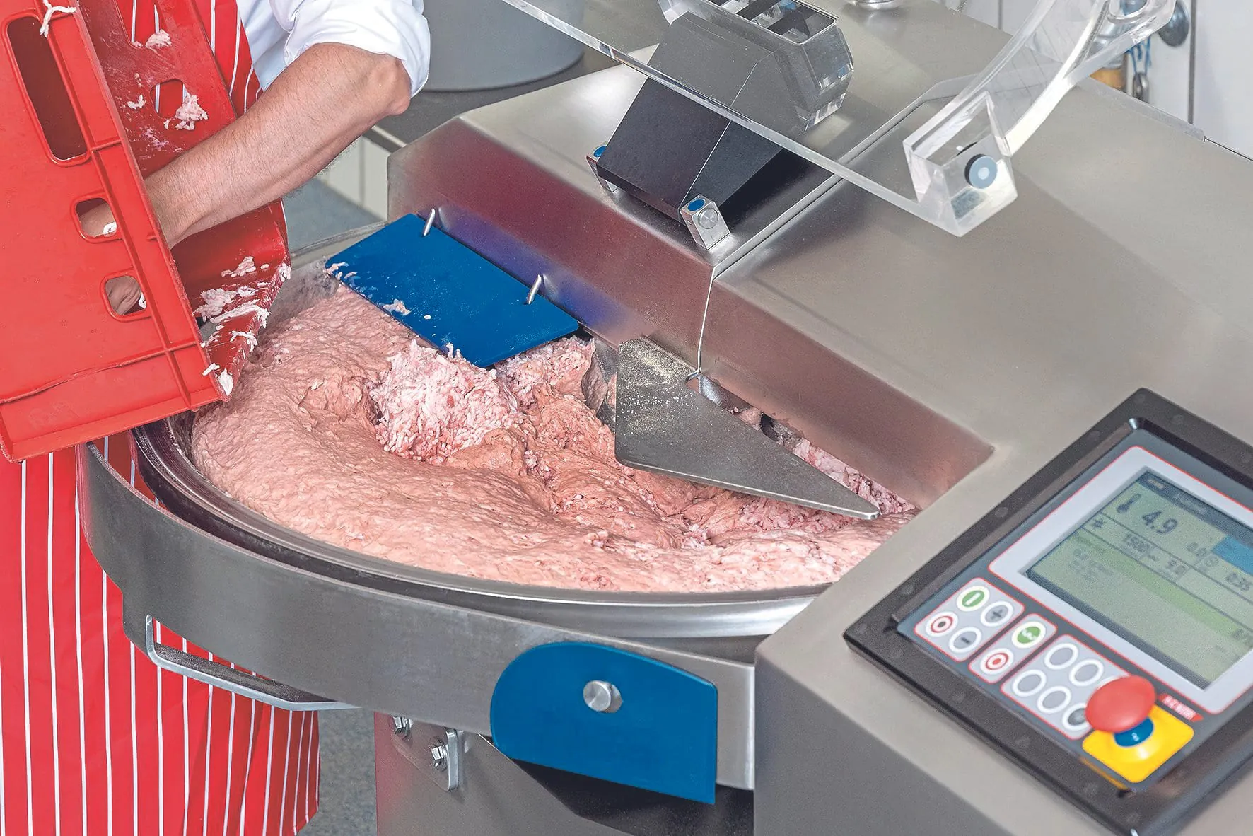 Nach und nach arbeitet der Metzgermeister das Grundbrät-Rezept ab, gibt Gewürze, Speck, Eis hinzu und startet den jeweils nächsten Verarbeitungsschritt. Dazu genügt übrigens auch das Schließen des Lärmschutzdeckels, ohne dass das Touchpad bedient werden muss. „Man hat ja die Hände als Metzger immer irgendwie voll, aber mit CutControl ist das nahezu kein Thema mehr, weil man mit Anheben des Deckels auf den nächsten Schritt springt. Man braucht dabei das Touchpanel gar nicht“, berichtet Thomas Landes von seinen Erfahrungen.