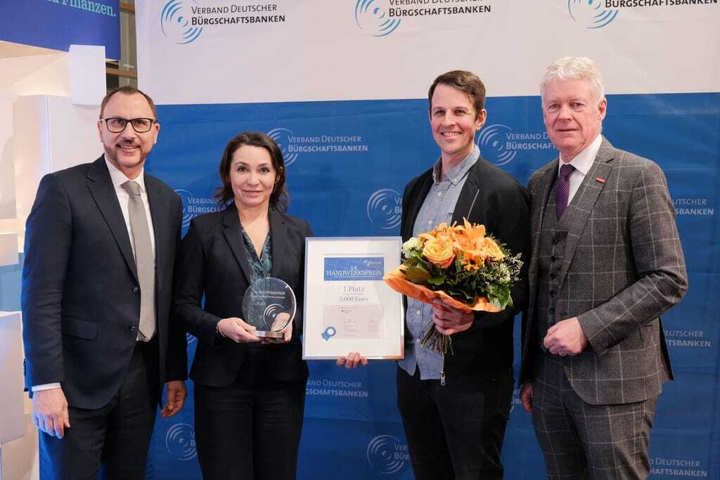 Überreicht wurden die Preise von Dr. Janina Jänsch, Abteilungsleiterin Mittelstand im Bundesministerium für Wirtschaft und Energie, Holger Schwannecke, Generalsekretär des Zentralverbandes des Deutschen Handwerks, sowie Guy Selbherr, Vorsitzender des Verbandes Deutscher Bürgschaftsbanken.