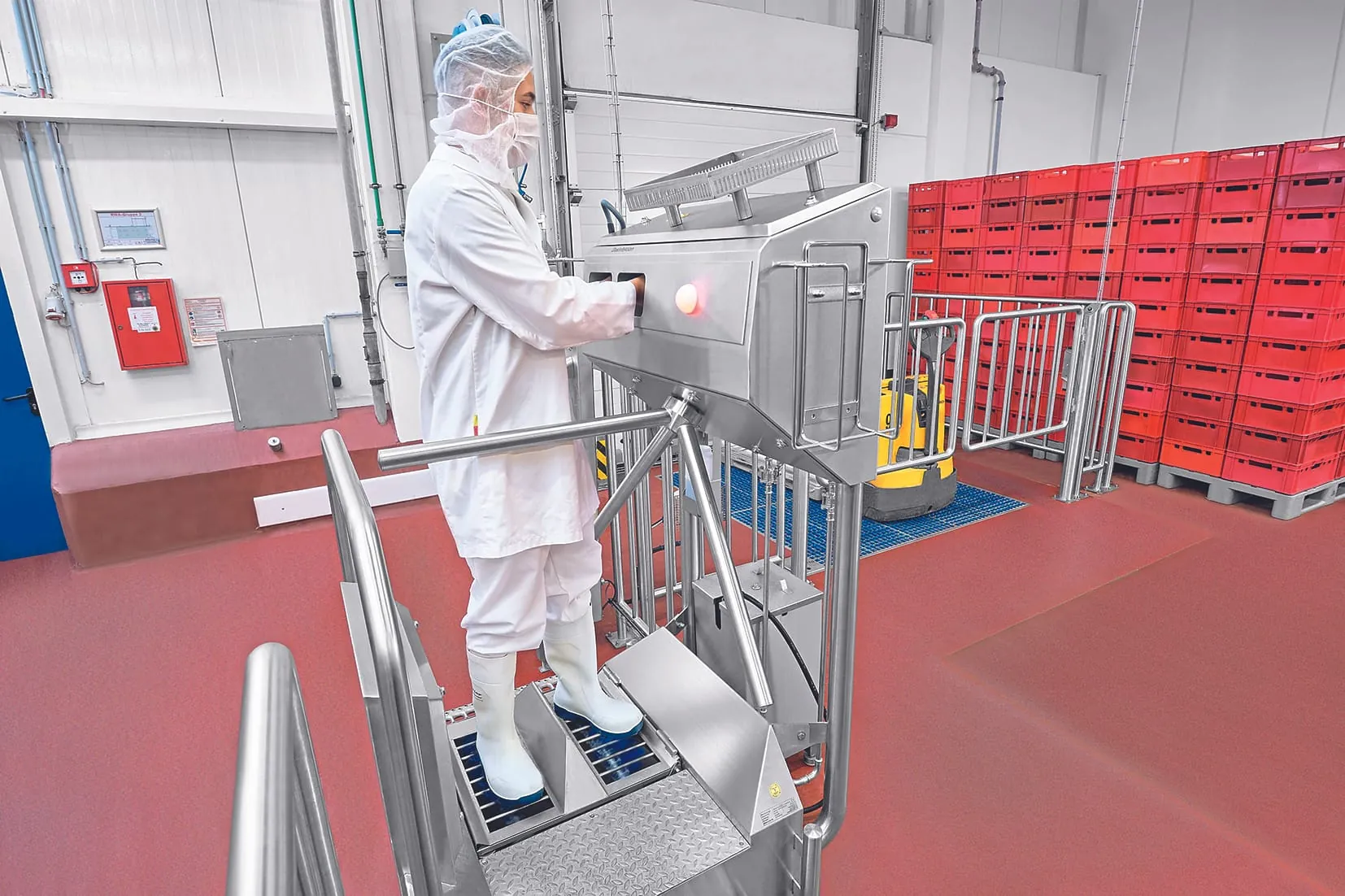 Im Rahmen der Zertifizierung war von besonderer Bedeutung, dass nicht nur die Räder der Flurförderfahrzeuge den Hygieneprozess durchlaufen bevor der Zonenwechsel stattfindet, sondern vor allem auch eine einwandfreie Personalhygiene gewährleistet ist. Zu diesem Zweck sollte eine nicht zu umgehende Hygieneschleuse zum hygienischen Reinigen der Schuhsohlen sowie zum Reinigen und Desinfizieren der Hände implementiert werden. Hierbei war das stärkere Mitarbeiteraufkommen bei Schichtbeginn, zu den Pausenzeiten sowie bei Schichtende zu berücksichtigen, um Personalstaus an den Hygienekomponenten zu vermeiden.